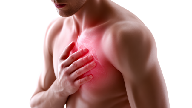 Man clutching chest in pain with red highlight isolated on transparent background