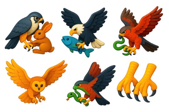3D Wild Hunting Icons. 3D icon set of wild hunting scenes: falcon clutching hare, eagle grasping fish, hawk with snake, owl diving