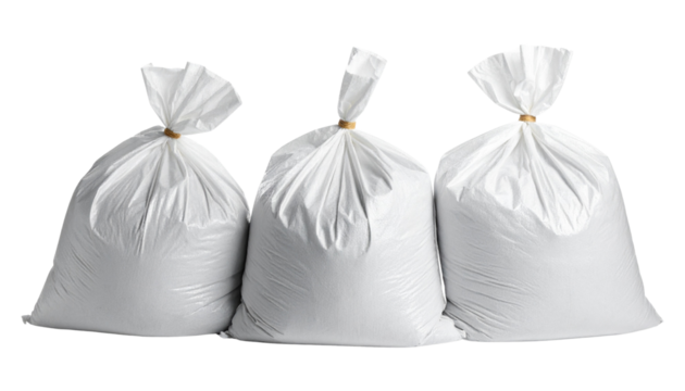 Three white garbage bags tied at the top, neatly arranged next to each other.