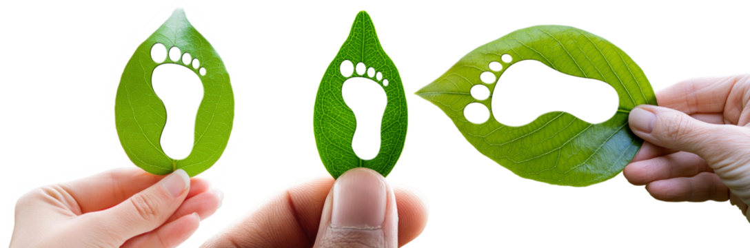 Extreme close-up of a human hand holding a green leaf with a footprint. Carbon footprint concept. Isolated on white or transparent background, png. Generative Ai.