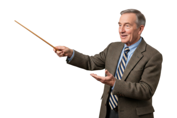 Senior male teacher or professor gesturing with a pointer stick while teaching a lesson.
