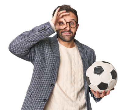 Hispanic male soccer coach in studio excited keeping ok gesture on eye.