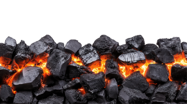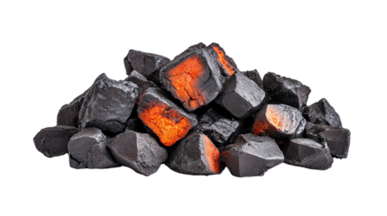 Heap of black coal chunks with glowing embers, ideal for energy and industrial-themed projects.