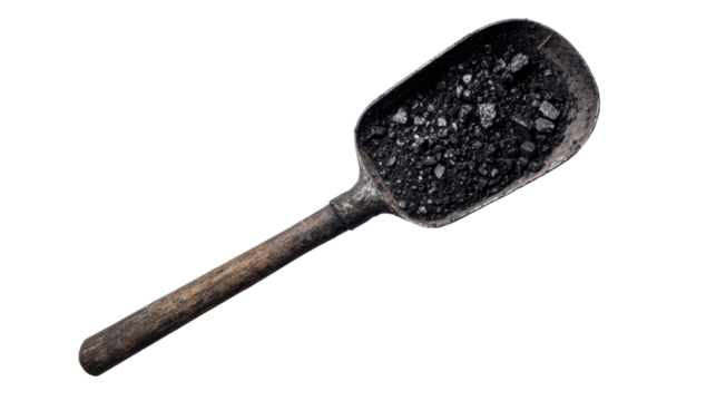 An old wooden scoop filled with black coal, representing traditional mining practices and the evolution of energy resources in various industries.