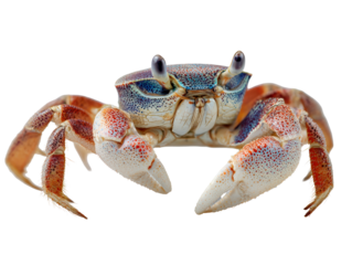 A small crab rests atop a smooth rock basking under natural light in a serene coastal setting, showcasing intricate details of its shell isolated on transparent background