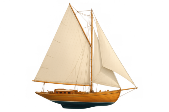 Classic wooden sailboat with crisp white sails, revealing traditional maritime craftsmanship against neutral backdrop