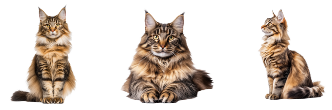 Maine Coon Cat Set Isolated on Transparent Background. PNG.