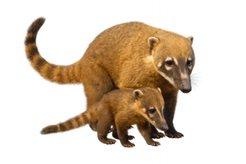 High-quality photo of two brown coatis standing and sniffing with their long ringed tails raised, isolated on transparent background PNG