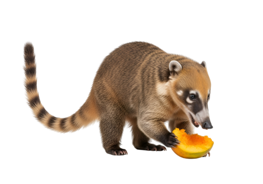 A coati, with a ringed tail, is seen in profile, holding a piece of orange fruit.