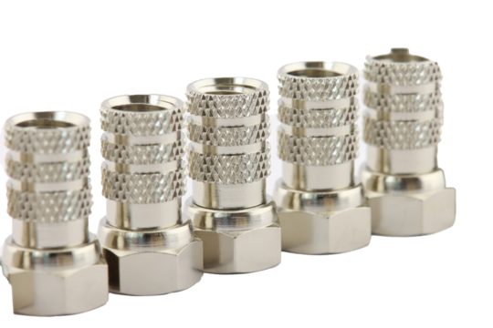 Metal F-connectors for connecting coaxial cable. Close-up. Soft focus.Transparent background in png.