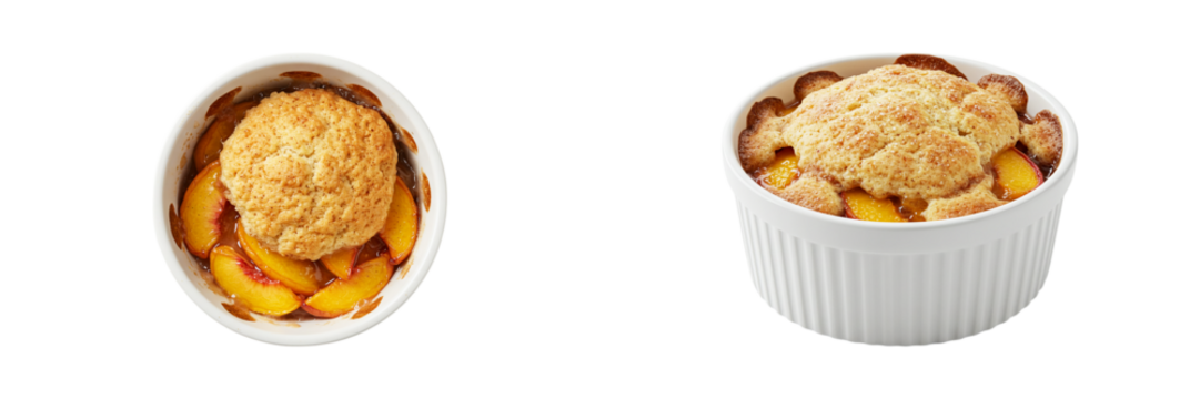 On transparent background a closeup view of a golden brown baked peach cobbler in a white ruffled ramekin