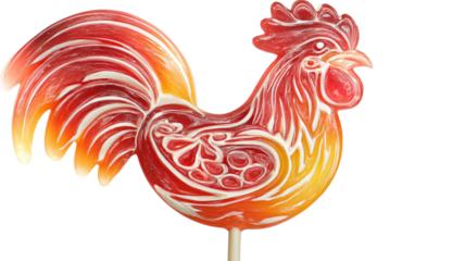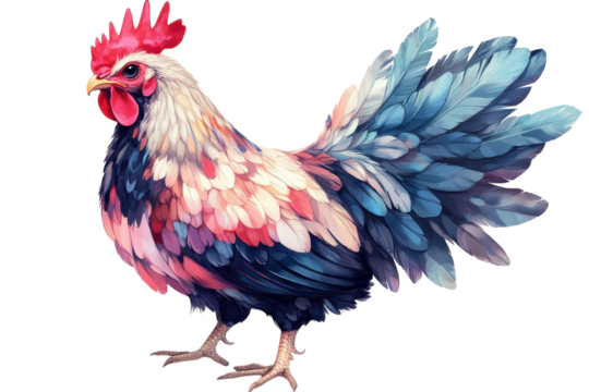 Colorful rooster with vibrant feathers standing proudly on a white background in a creative artistic representation
