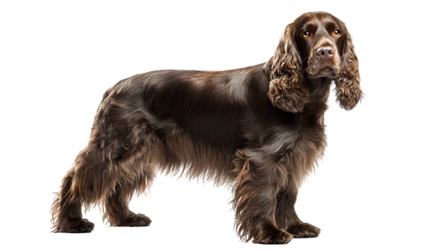 A Cocker Spaniel standing gracefully, isolate on white background, showcasing its long ears and friendly expression. PNG
