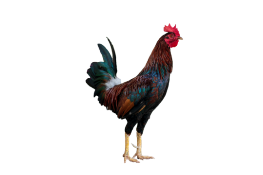 A chicken standing tall, isolate on white background, showcasing its proud stance and vibrant feathers