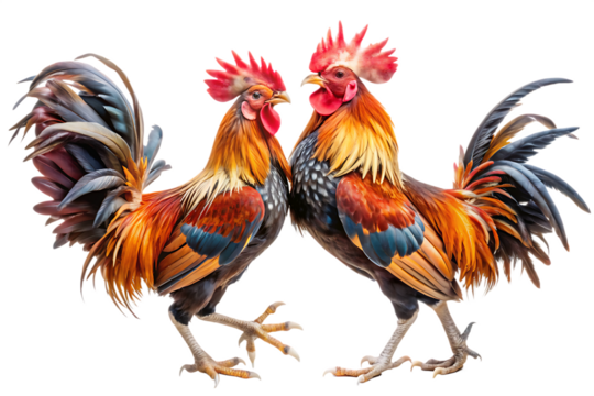 Two roosters locked in a fierce battle are realistically captured in a dynamic image, isolated against a pure white backdrop, highlighting their aggressive postures and sharp details