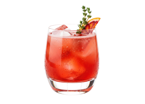 red blood orange cocktail with thyme garnish, transparent glass overlay