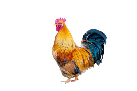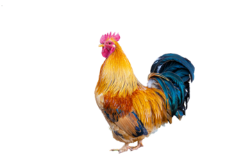 Colorful rooster with vibrant plumage and prominent comb, showcasing intricate feathers, isolated on a white background