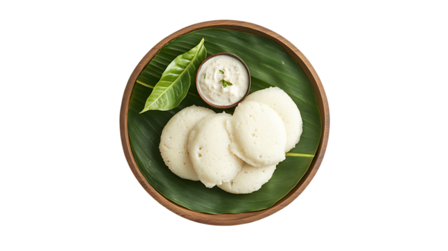 Idli with coconut chutney on banana leaf isolated on transparent background