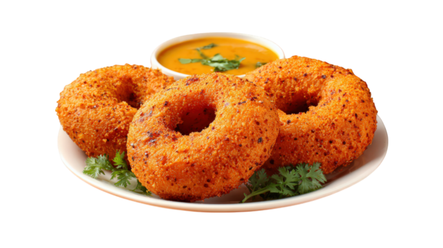 Meduvada with sambar and coconut chutney, a South Indian breakfast dish, served on a brown plate, isolated on transparent background.