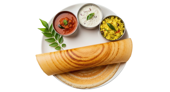 Crispy dosa served with four colorful chutneys in small bowls, featuring coconut, tomato, mint, and sambar flavors on transparent background.