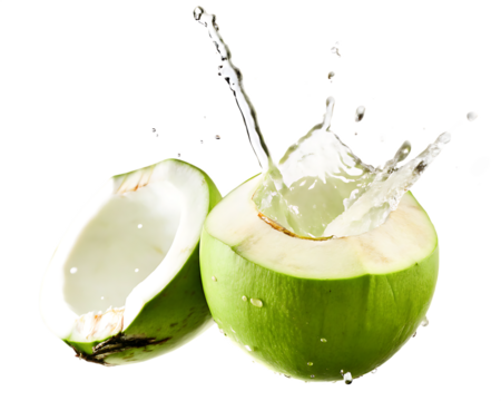 coconut water splashing out of a fresh green coconut  isolated on white background PNG, AI GENERATED