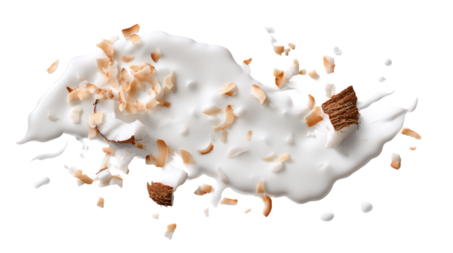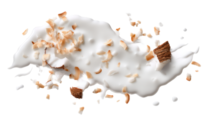 Single slice of fresh coconut cake resting on a bed of shredded coconut with a transparent background, perfect for food blogs, menus, or advertising