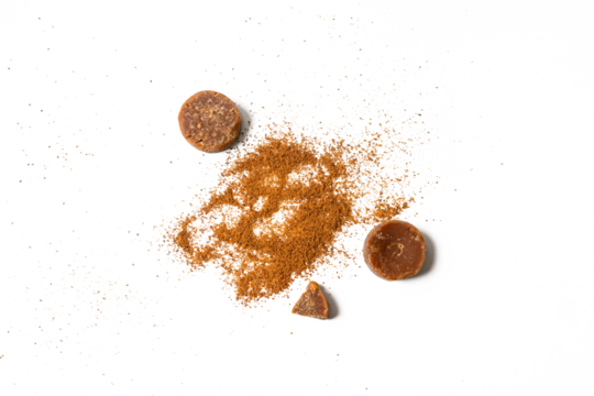 organic brown palm sugar or jaggery isolated on white background.