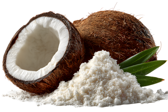 Pristine, freshly cracked coconut meat with rugged brown shell, creamy white pulp, delicate curls, on transparent background, soft high-key lighting, natural tropical health concept.