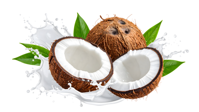 Two halves of a coconut and a whole coconut surrounded by splashing white liquid and green leaves on a white background.