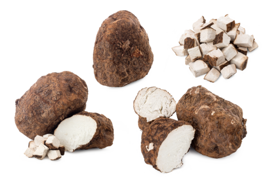 traditional Chinese medicine some fresh poria cocos and cut poria on white background.