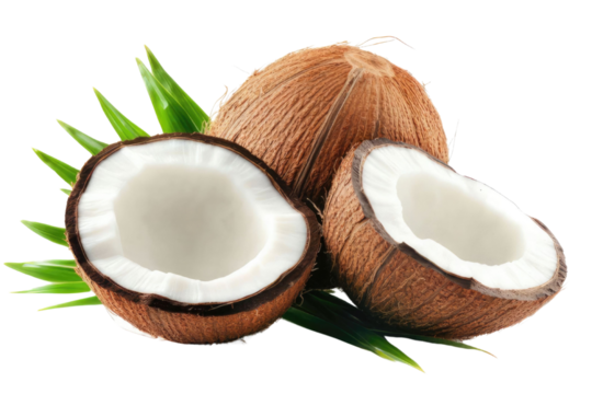 Refreshing tropical summer coconut with natural husk texture and juicy white pulp, isolated on high‑resolution transparent PNG background, ideal cutout for exotic drink branding, beach vacation