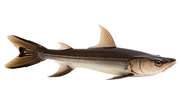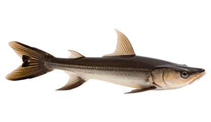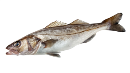 White fish with cod detailed scales, open mouth, and fins isolated on white transparent background, concept of marine wildlife.