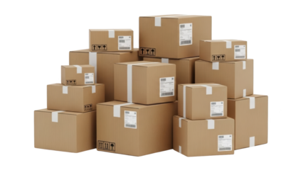 Stack of cardboard boxes with labels and barcodes in a warehouse or storage setting viewed from the front.