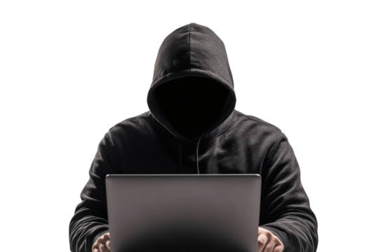 Mysterious hacker working on laptop in dark hoodie, conveying a sense of cybercrime and security threats