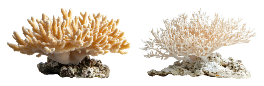 Two Coral Specimens One Ivory And One Pale Orange Displayed On Dark Rocks Against A Transparent Background
