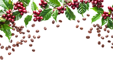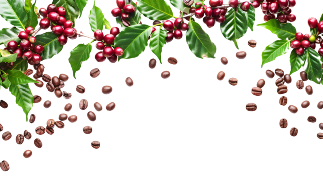 Coffee plant branch with green leaves and ripe coffee cherries, perfect for botanical illustrations and organic product branding on transparent background PNG