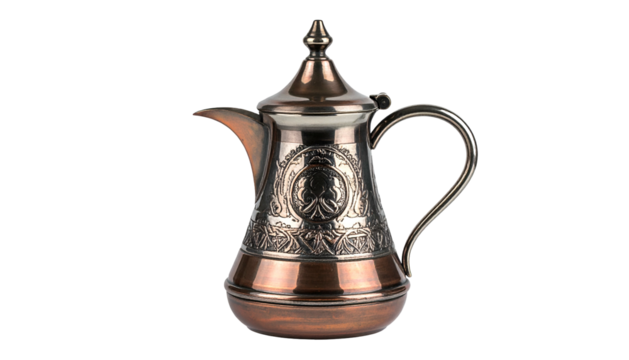 Ornate copper and silver coffee pot with intricate engravings and long spout