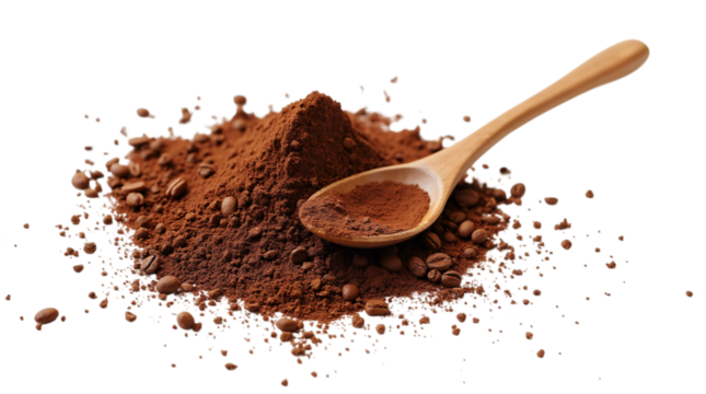 Coffee Powder with Wooden Spoon Isolated on Transparent Background (PNG).