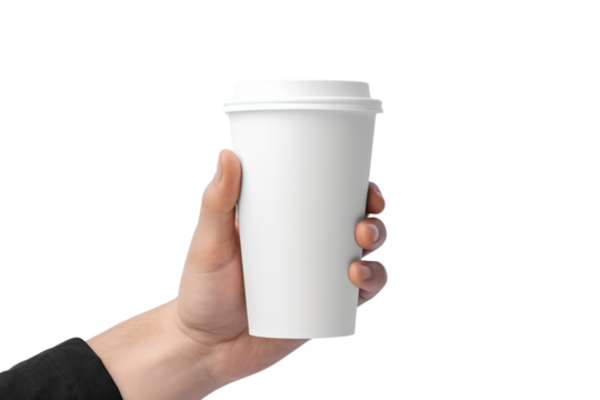 Close up male hand holding a Coffee paper cup,Paper coffee cups, recycled isolated on transparent and white background.PNG image.