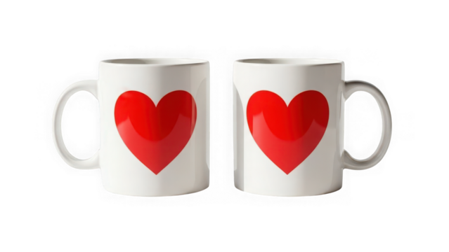 Two white coffee mugs with red heart design isolated on transparent background