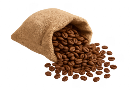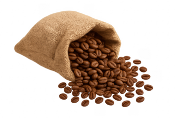 Coffee beans spilling from burlap sack on transparent background