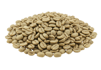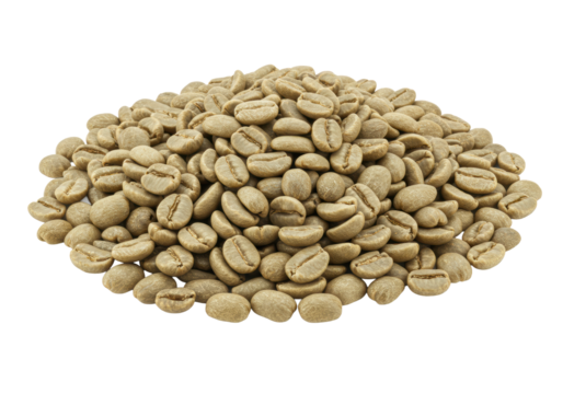 A generous, organic mound of raw green coffee beans, pale green to olive, with natural textures and silver skin remnants, on a transparent studio background with copy space for commercial
