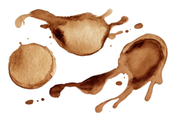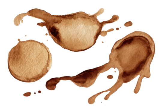 Abstract coffee stains and splashes in various shapes and sizes, creating a textured pattern, isolated on white background