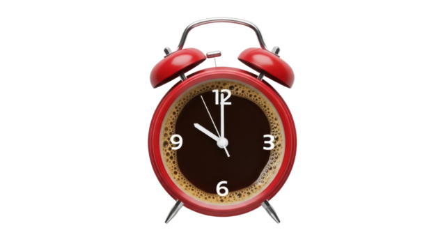 Red alarm clock with coffee inside isolated PNG, creative time management concept for waking up and starting the day with energy and focus