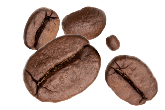 Roasted coffee beans creating a small pile, brown cafe grains for a refreshing beverage, transparent background