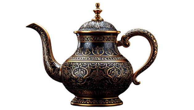 Vintage Arabic dallah made of copper and brass, traditional Middle Eastern coffee pot transparent png background. Ai generated