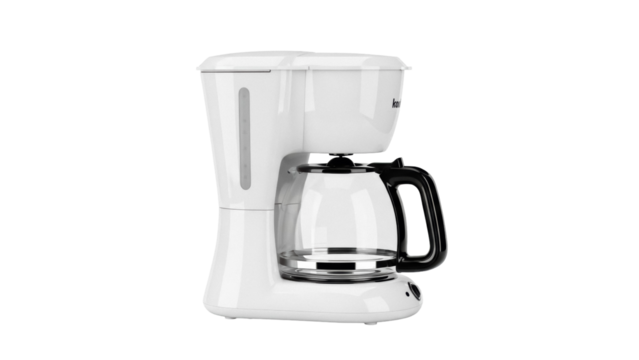Isolated Red Coffee Machine Dispensing Hot Espresso into a White Cup