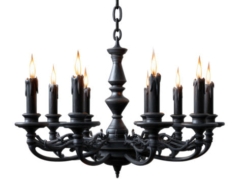 Ornate black medieval-style chandelier with burning candles and melting wax.