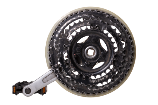 Bicycle crank and large sprocket on isolated background.