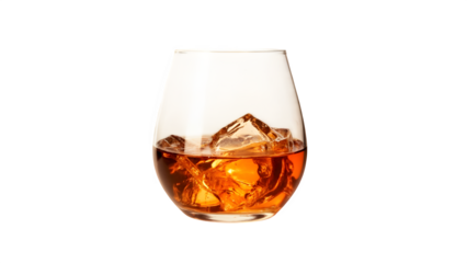 An isolated representation of a cognac glass containing amber liquid on a white backdrop